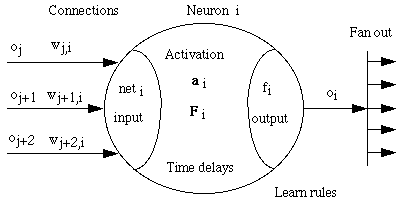 Neural networks are often decomposed into the following components: - Processing units These neurons receive inputs from other units, calculate an output and send that to other neurons. Often there are input and output neurons, that connect it to the world outside, and internal or "hidden" neurons. The values of the signals are often restrained to the interval [0,1] or [-1,1]. |