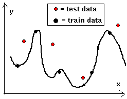 On the grounds of training data, the net on the left has learned the underlying trend in the curve well, the test data lies well in the neighborhood of the curve. To the right we see the results of "over-learning", by taking the net on the left and teaching it more or by using a net with more hidden neurons. The training data lie precisely on the curve, but the test data exhibits large deviations. |