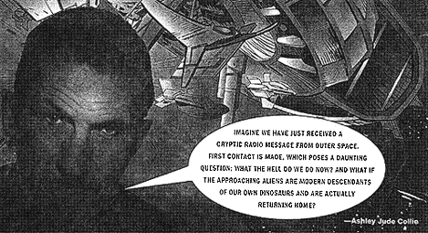 "Imagine we have just received a cryptic radio message from outer space. First contact is made, which poses a daunting question; what the hell do we do now? And what if the approaching aliens are modern descendants of our own dinosaurs and are actually returning home?"