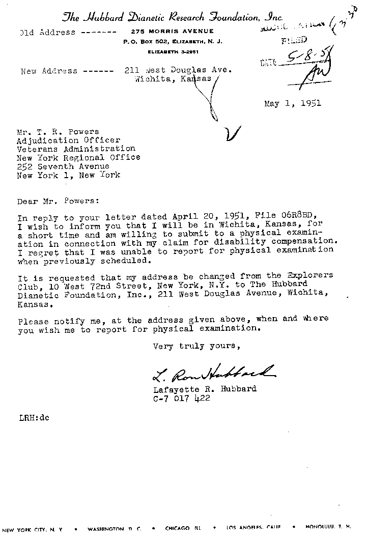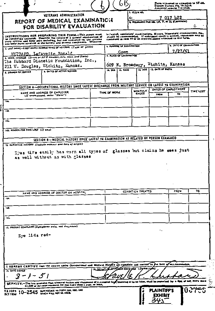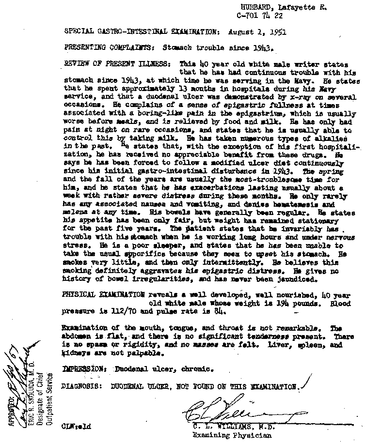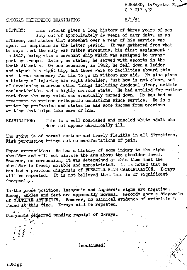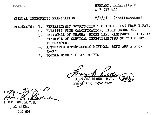 What can [the reactive mind] do? It can give a man arthritis, bursitis, asthma, allegies, coronary trouble, high blood pressure and so on, down the whole catalogue of psychosomatic ills ...L. Ron Hubbard devised Dianetics in 1949. He published Dianetics: The Modern Science of Mental Health (from which the above quote is taken) in May 1950. Yet, as the following series of papers shows, he was still claiming a disability allowance from the Veterans' Administration for conditions which a doctor diagnosed as no less than arthritis and bursitis. Naturally, this was not made public, but it is deeply ironic that he should have submitted his application for a further physical examination on Hubbard Dianetics Research Foundation headed paper. One has to wonder why two years of Dianetics apparently hadn't alleviated his own complaints!Discharge the content of this mind's bank and the arthritis vanishes, myopia gets better, heart illness decreases, asthma disappears, stomach functions properly and the whole catalogue of ills goes away and stays away.