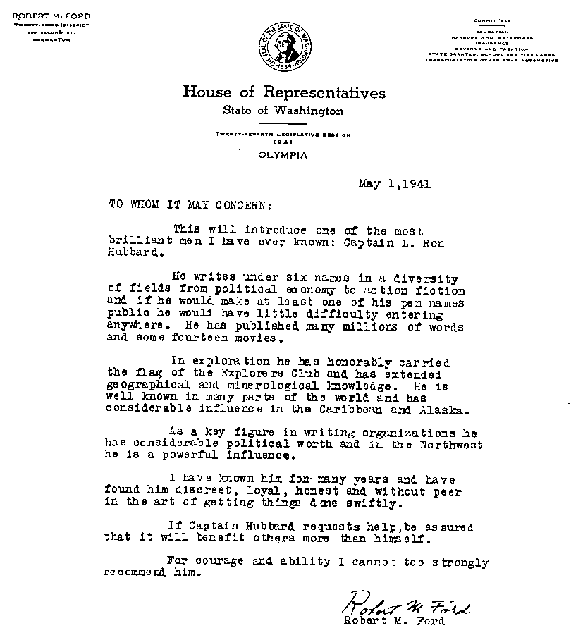 This truly extraordinary document is signed by Robert M. Ford - the signature is quite genuine - but was actually written by L. Ron Hubbard. The two men were old friends, living near each other in Bremerton, Washington, and before Ford was elected to the House of Representatives the two families would regularly visit each other, go on fishing trips, etc.