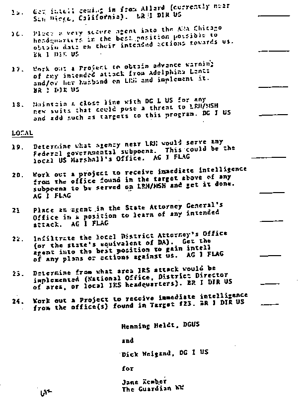 "very quickly pre-alert [me to] any trouble so I can go fishing until you handle.These instructions were followed to the letter. The Guardian's Office initiated what Church lawyers described, in a 1979 case in England, as "robust American methods of defence" (sic). The following document, "GO Program Order 158", was a detailed breakdown of how Hubbard's order was to be implemented. Its circulation was restricted to just six people (including the authors) to maintain security. All six, plus five others including Hubbard's wife Mary Sue, were convicted in 1979 of crimes against the US Government and served several years in jail; upon their release they were formally expelled from the Church. Oddly, though, one of their number, Dick Weigand - also one of the authors of the following document - has been spotted in Colombia selling Scientology to the Colombian armed forces.AND WE COUNT ON YOU GUYS TO MOW IRS DOWN AND WIN ACROSS THE BOARDS."