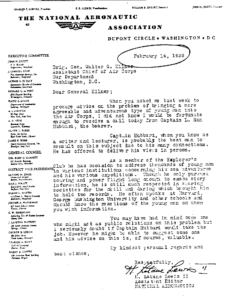 In 1938, L. Ron Hubbard tried to enter the US Air Corps on the back of his (largely mythical) reputation as a daredevil pilot and barnstormer. In fact, he had never even held a licence for powered aircraft. This did not stop him from persuading his friend H. Latane Lewis II, the editor of Sportsman Pilot, to make representations on his behalf. Lewis sent the following letter:
