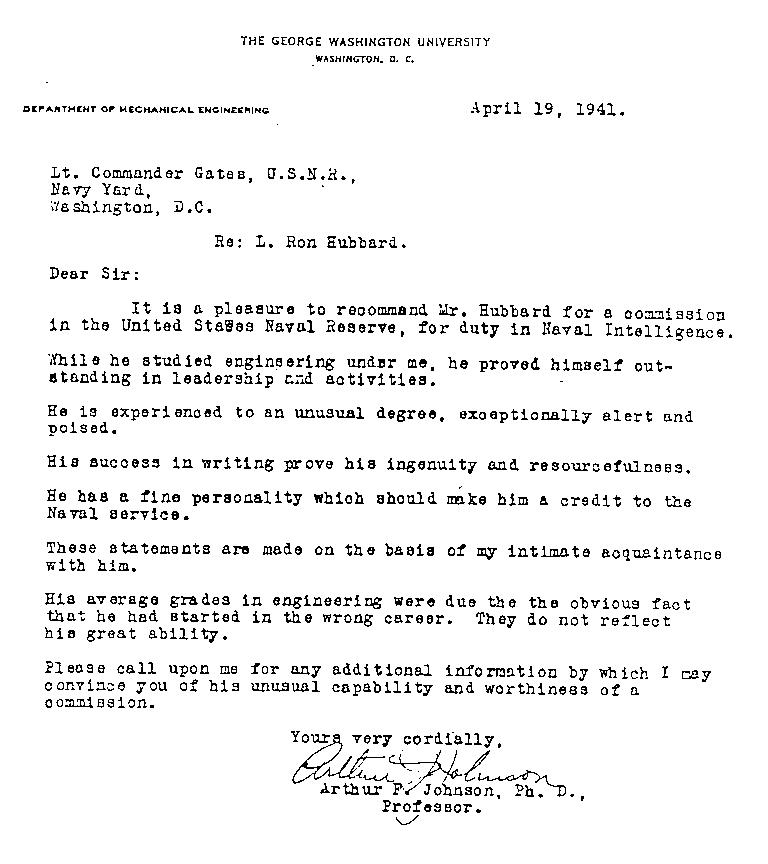 Prof. Johnson was the Dean of the School of Civil Engineering at George Washington University, and was Hubbard's supervisor during the latter's abortive two-year stint at GWU. They appear to have got on well and the following letter was no doubt a great help to Ron in explaining his dismal academic record.