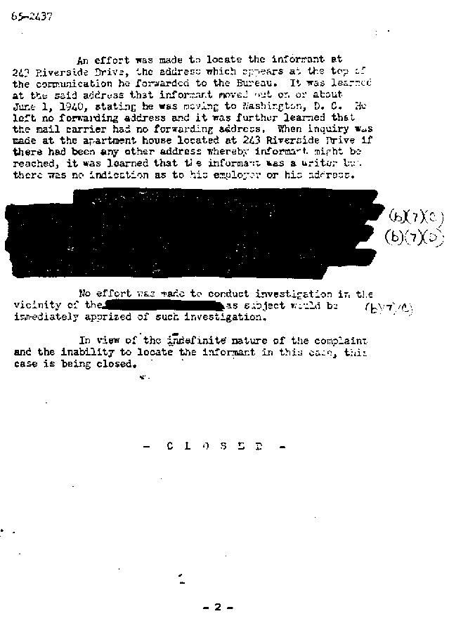 In 1940, L. Ron Hubbard was living a hand-to-mouth existence in New York City, writing penny-a-word pulp fiction stories. Whilst there, he apparently had an argument with a steward in the hotel at which he was staying. He promptly got revenge by denouncing to the FBI the unfortunate man, who was of German descent, as being "a menace to the state". This was, it seems, the first contact he had had with the FBI and began what became a long tradition for him of denouncing to the authorities those he disliked. It also emphasised his Germanophobia, a trait which he never lost (and which is still visible today in the Church of Scientology's campaign against the Federal Republic). Needless to say, the allegation was patently baseless and the FBI took no action.