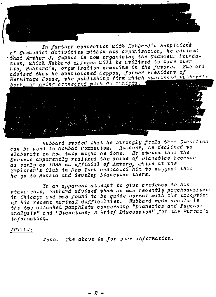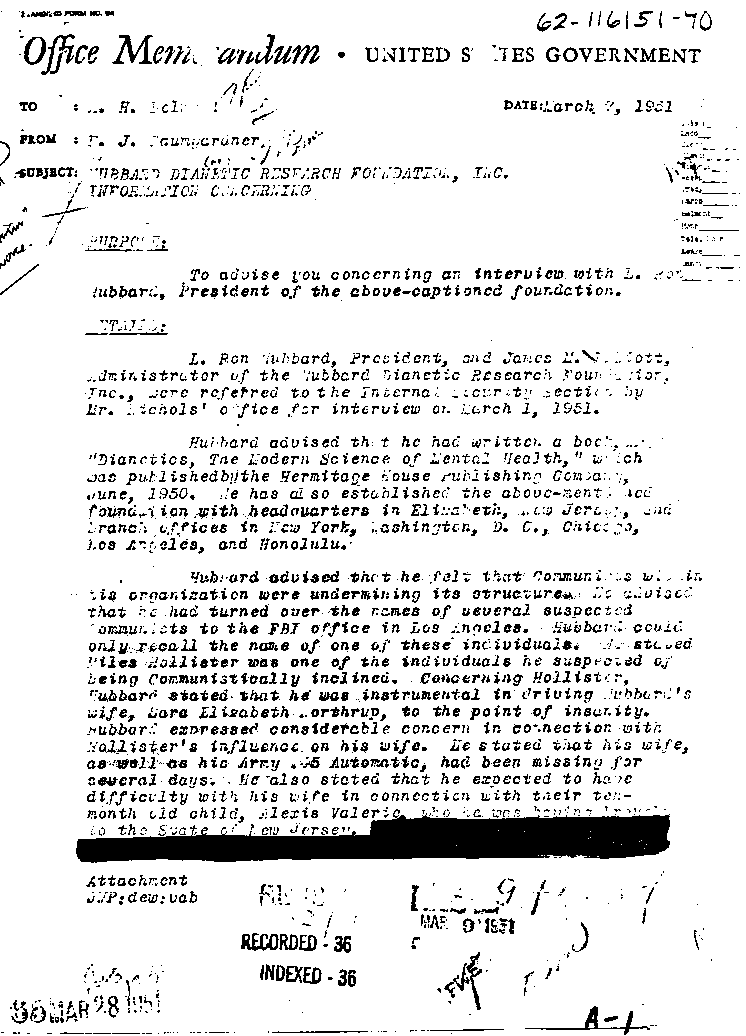 When the FBI received a letter from L. Ron Hubbard denouncing his wife Sara as a "suspected communist" and "drug addict", they followed it up with an interview. The following document records the outcome of the interview:
