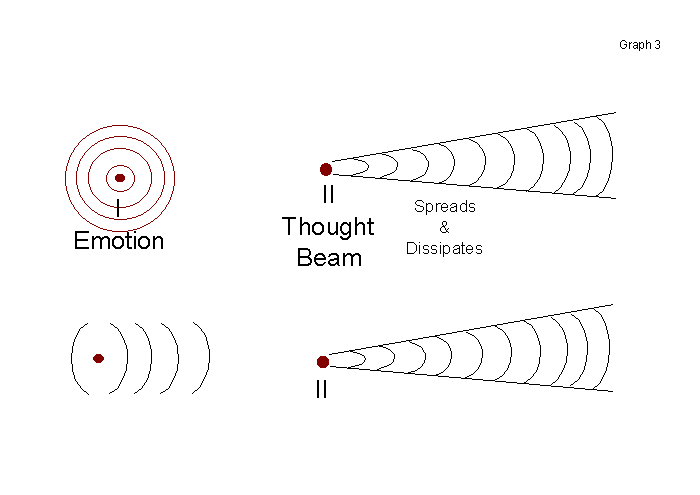 OK. Number 2, we have the beam, the thought beam. OK, this one goes like this. Thought beams... they start out and they spread. This follows the same pattern of a water hose or sending out a flow of water or air or anything else trying to direct it in a straight line, but due to the interference and the things that it's receiving counter-efforts from in the universe, it tends to spread out and dissipate. OK. So the thought beam here spreads, and if you look at that from this way (from above), it also spreads like this. It goes out in a cone, in a cone and from here spreads out. So essentially what's happening is it spreads and dissipates. That means that as it goes out it's intensity becomes less. I don't know the exact mathematical law on that, whether it's the double the distance with one quarter of the effect that you might have in a gravity formula or in a sort of light intensity formula or a sound formula, where as you go twice as far away from something it only has one quarter of the effect, that's usually for spherical, spherical outflow. I'm sure that would work here (TPB 1), but in this (TPB 2) beam there is some spread on it and some dispersion. That would be more analogous to a laser, because a laser that starts off from here on Earth and hits the Moon, it starts off from here as a thin pencil of light and on the moon it may make a space that big (2 meters in diameter). So it is to some degree dispersing and if it kept going out it would finally disperse totally. But it (TPB 2) is more controlled than this (TPB 1) which just goes out; "Wah...." all over, eh? So it's a controlled flow and it's a beam (TPB 2). However, this is the one that I have noticed that the Russians are using right now.