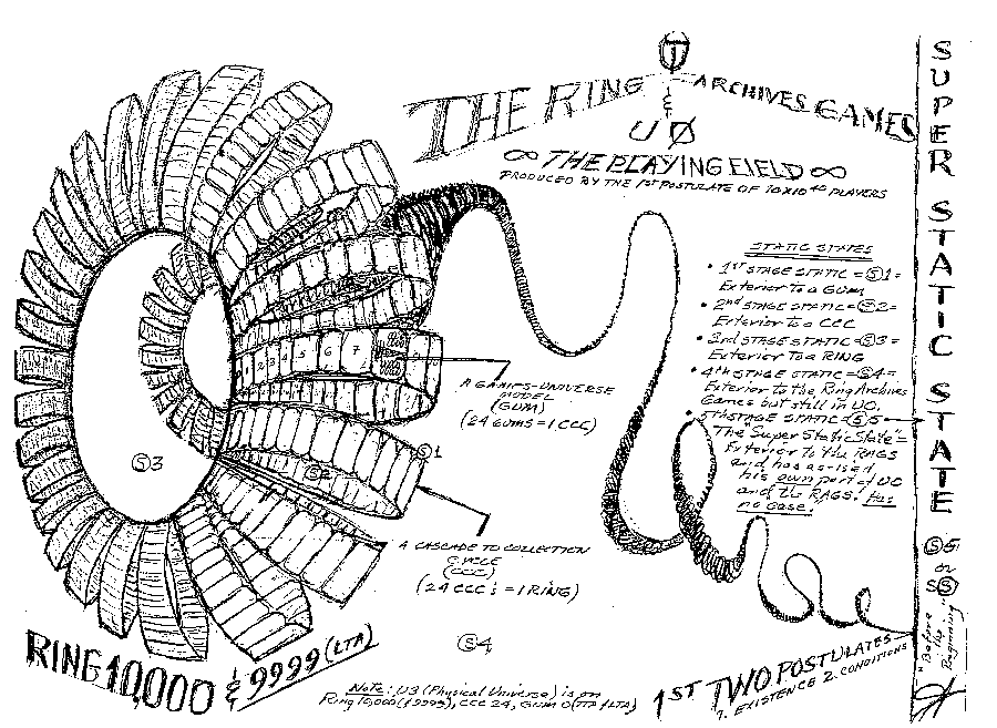 Now before THIS Games Universe Model there were others, but they were based on other conditions, lower conditions, and other combinations of Dynamics (in this particular series of Games of the Games Universe Models). And a series of Games Universe Models -24- there are 24 Games Universe Models in one series- and I call that a "Cascade to Collection Cycle". That is when the thetans "cascaded" into the Series of Games like a waterfall. "Yeah ! Lets go play!" And when they "collect up" to find out what they did, and they debrief to each other, and say: "Oh, What a great Game it was!" (or series of Games). So, 24 Games Universe Models would be a Cascade to Collection Cycle. Now also 24 Cascade to Collection Cycles equals 1 "Ring". And a "Ring" is a "Ring of Games" which is 24 GUMs x 24 CCC's (Cascade to Collection Cycles) or 576 GUMs. That is 1 of these "Rings". It is one ring and it looks like a large "doughnut shape", and there are the CCC's (24 of these) "wrapped around" or going around making the ring, and there are 24 GUMs on each one of the CCC's. These are all in "position" on this Ring. Now in the entire series of Ring games, since original Static State ("before the beginning Static State", which is talked about in the "Factors" by LRH, "before the beginning"), there were 10,000 Rings. That gives over 5 Million Games Universe Models! Figure it out. It's right there. And we are in the ring number 10,000 and that's something to know. We are in the Ring 10,000 and that is the last ring in this "Ring Archives Games", and those are the Games which were all agreed upon by 1st and 2nd postulates of the Thetans playing them. This is all finally handled on the "Super Static Rundown" after OT16. Those Rings and games were the "Existence" and the "Conditions" postulates.