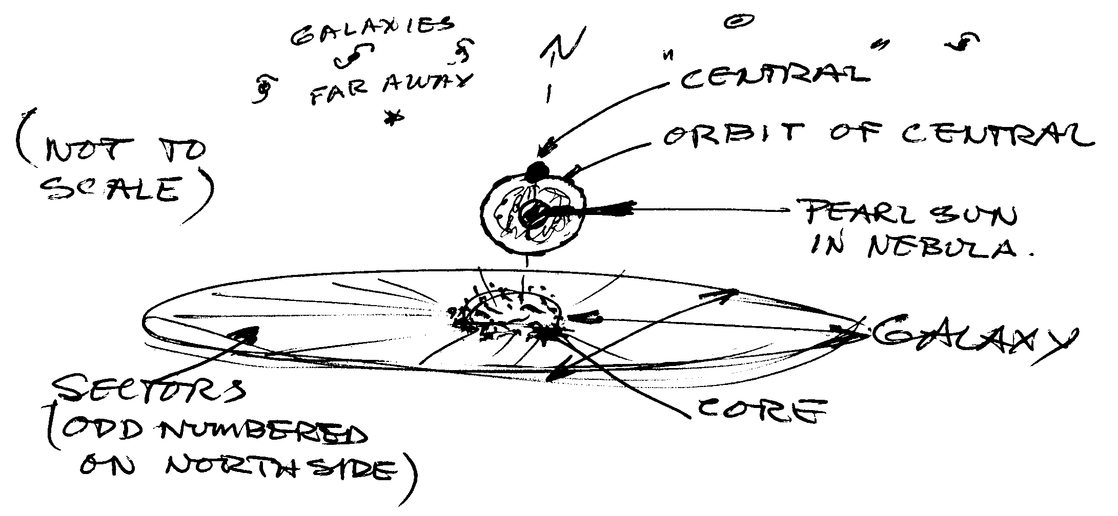 "Central" is a planet circling a pearl-colored sun some distance out, toward the "North Pole" or axis of the center of this Galaxy. It is outside of and "above" the great cluster of stars forming the center.